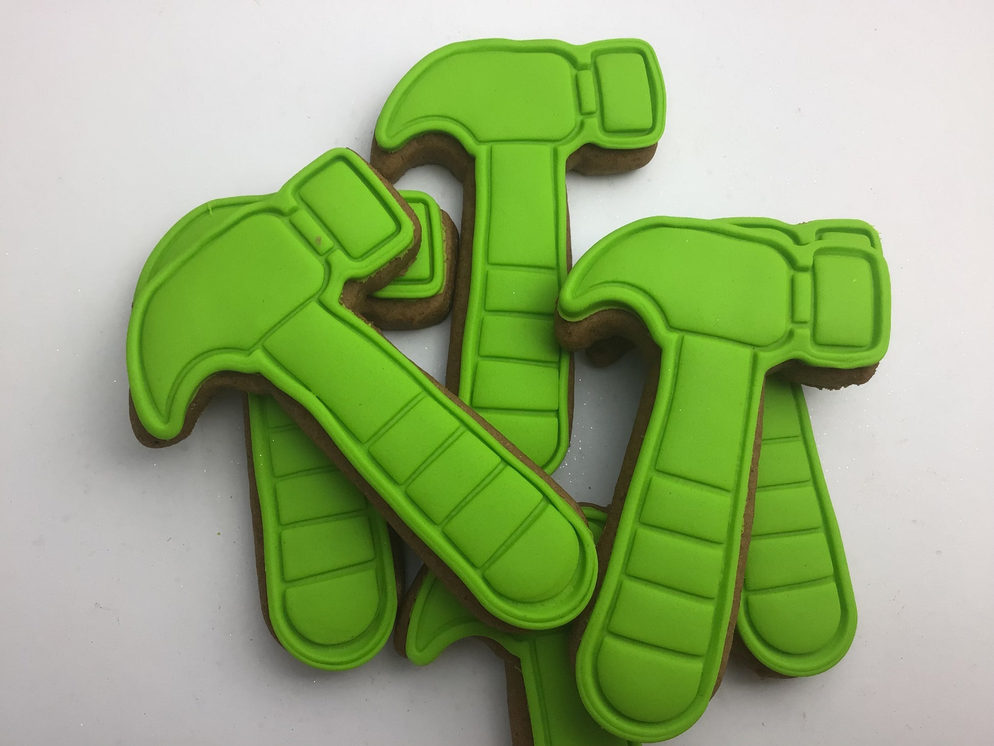 Hammer shaped gingerbread cookie topped with lime fondant
