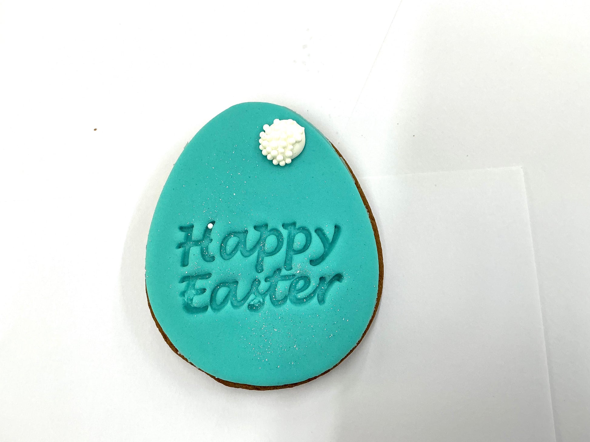 These lovely gingerbread eggs are topped with fondant and white sprinkles
