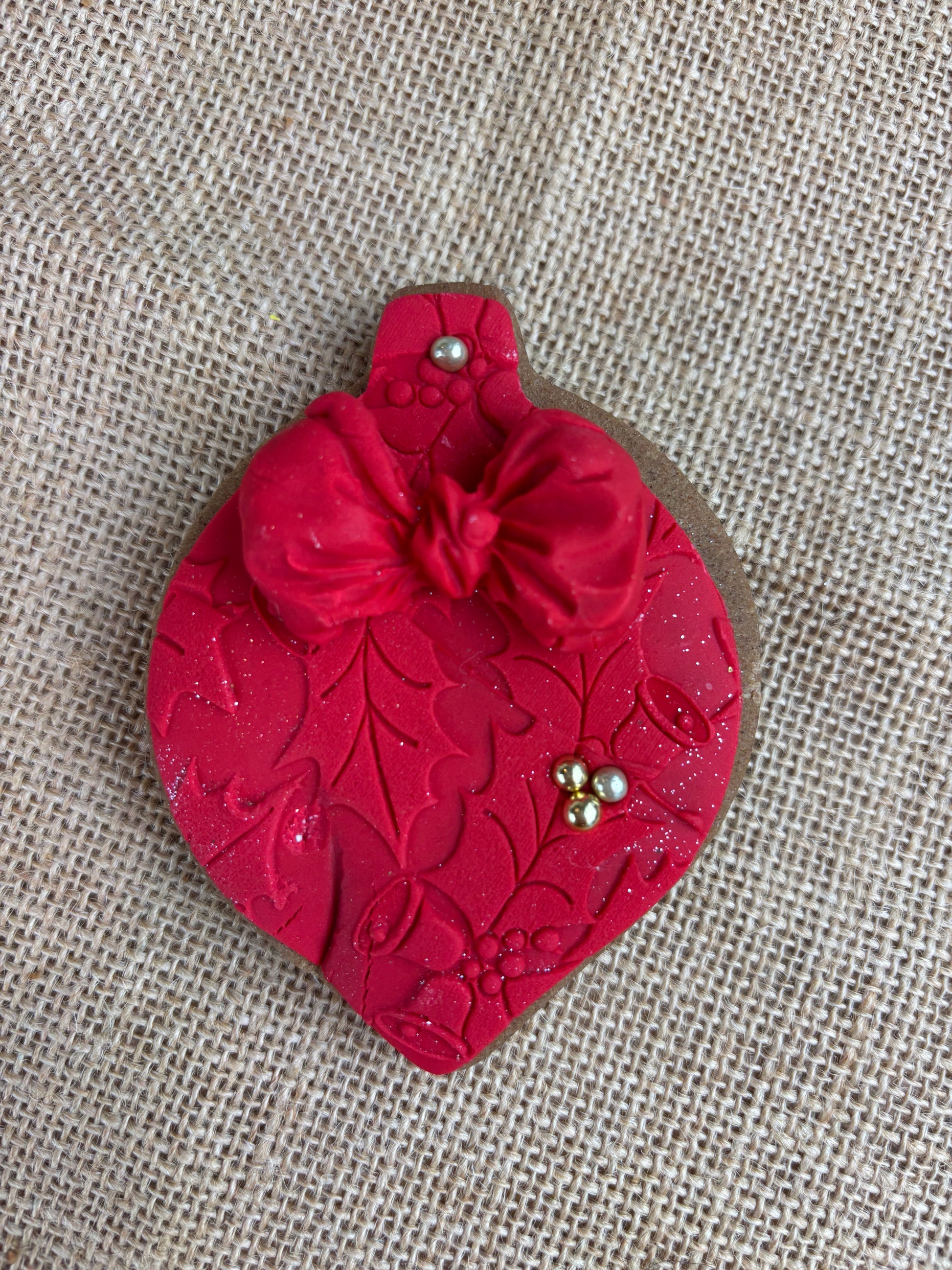 Deck the halls with this oh so pretty gingerbread bauble. Topped with fondant and gold cachous.
