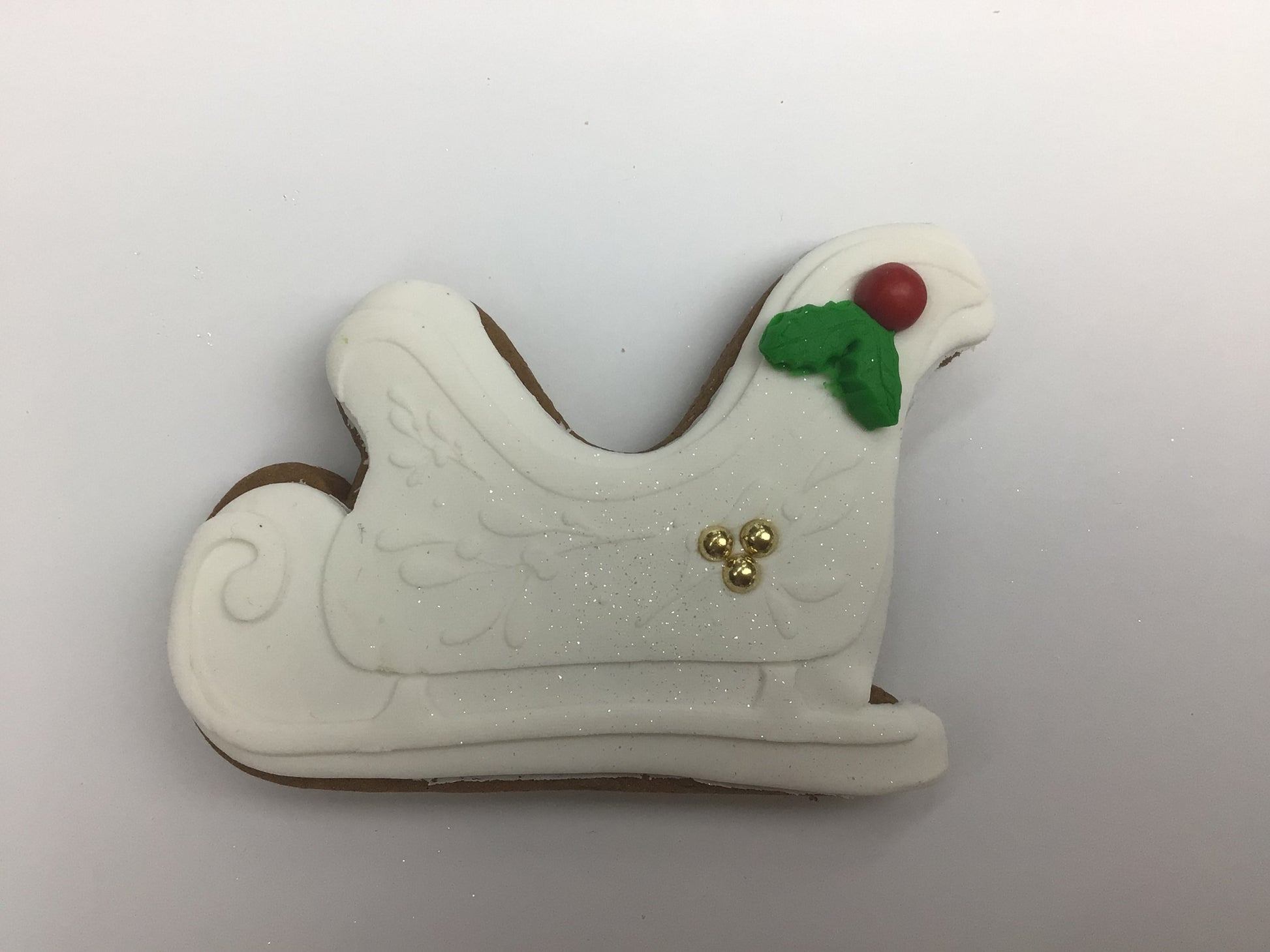 Santa’s ride has arrived! Sleigh themed gingerbread cookie topped with fondant and red sugar ball.