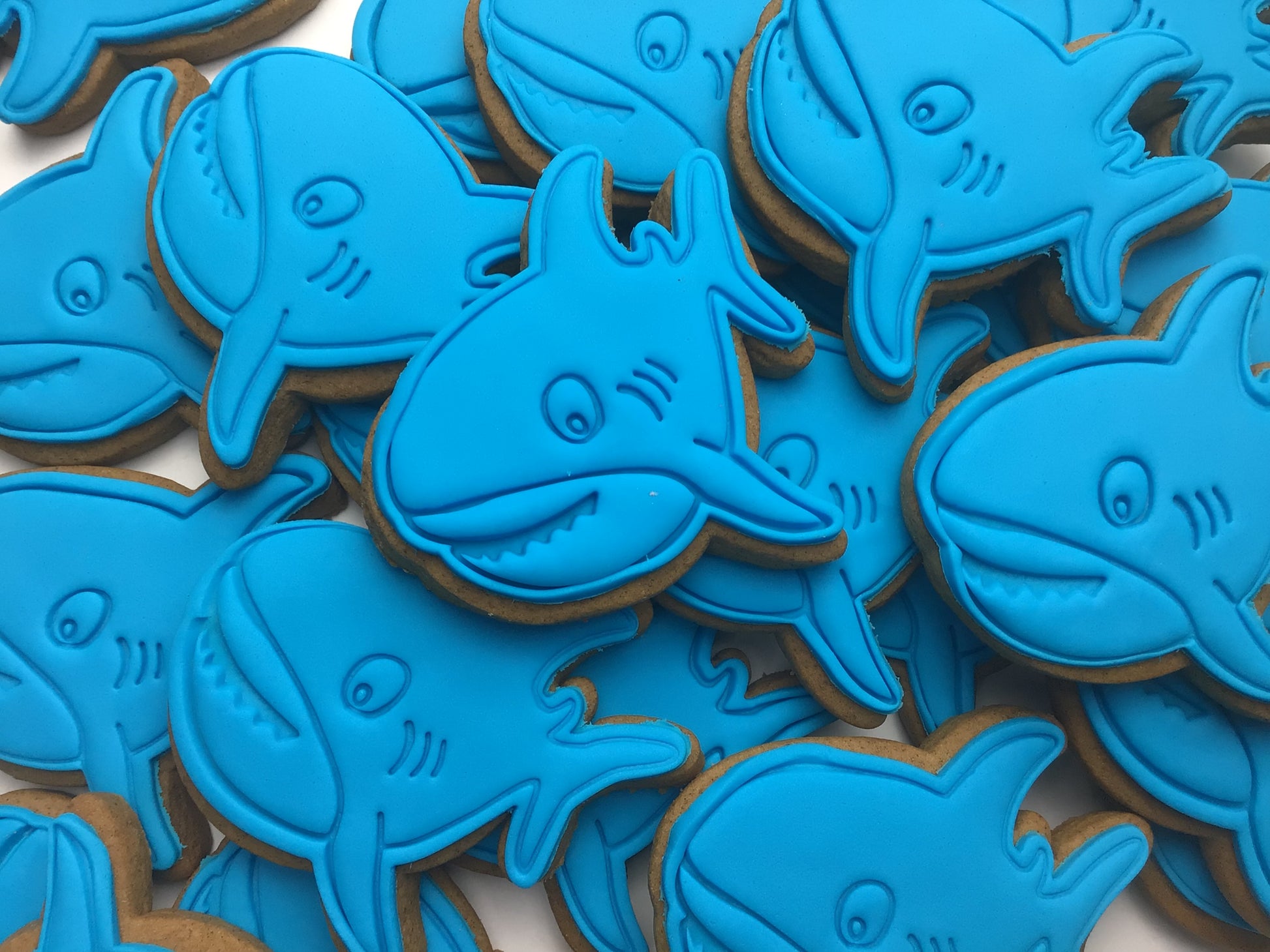 Shelly the shark gingerbread cookies topped topped with blue fondant icing