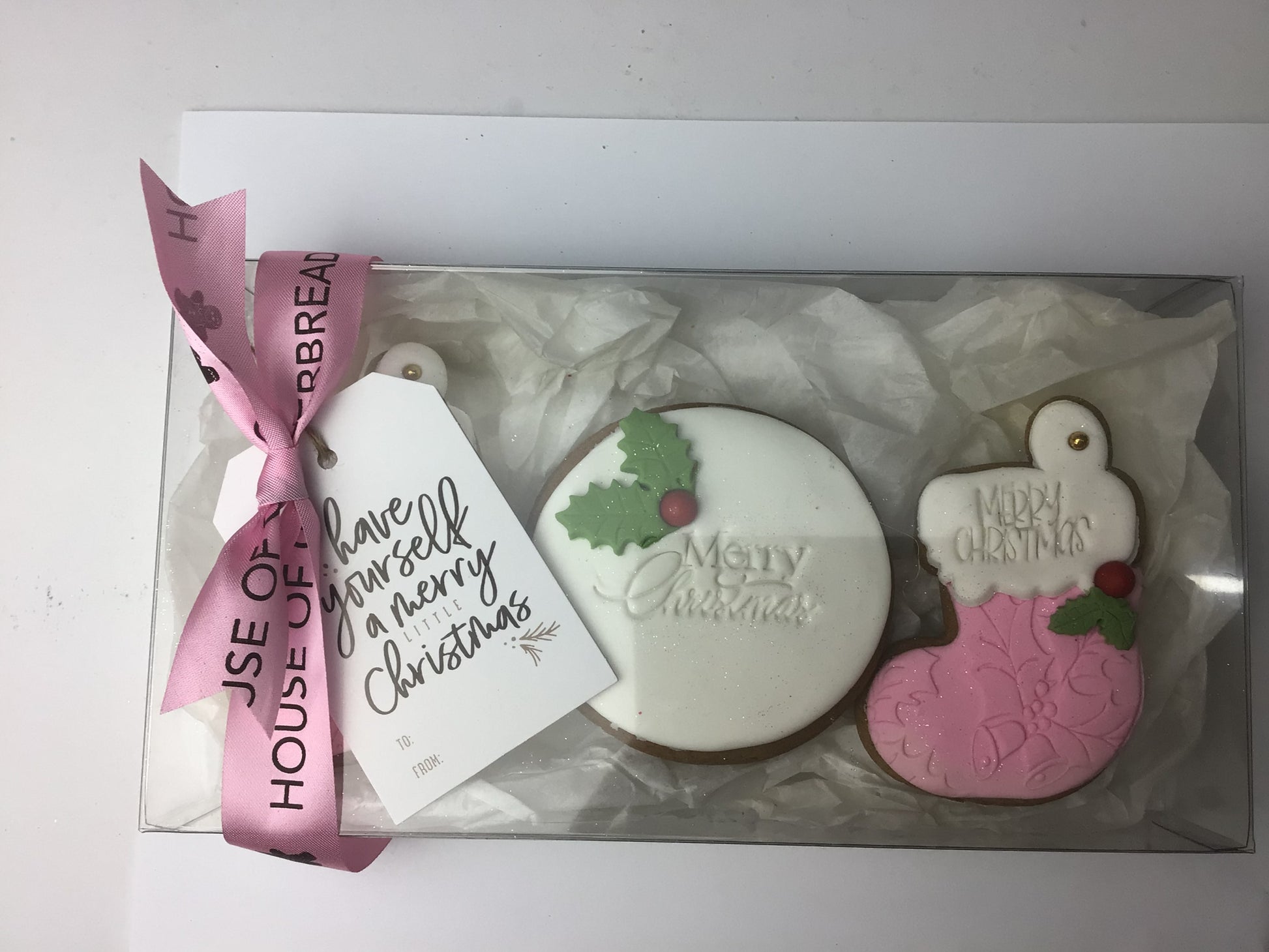 delicious stocking themed cookies topped with fondant, gold cachous and red sugar ball