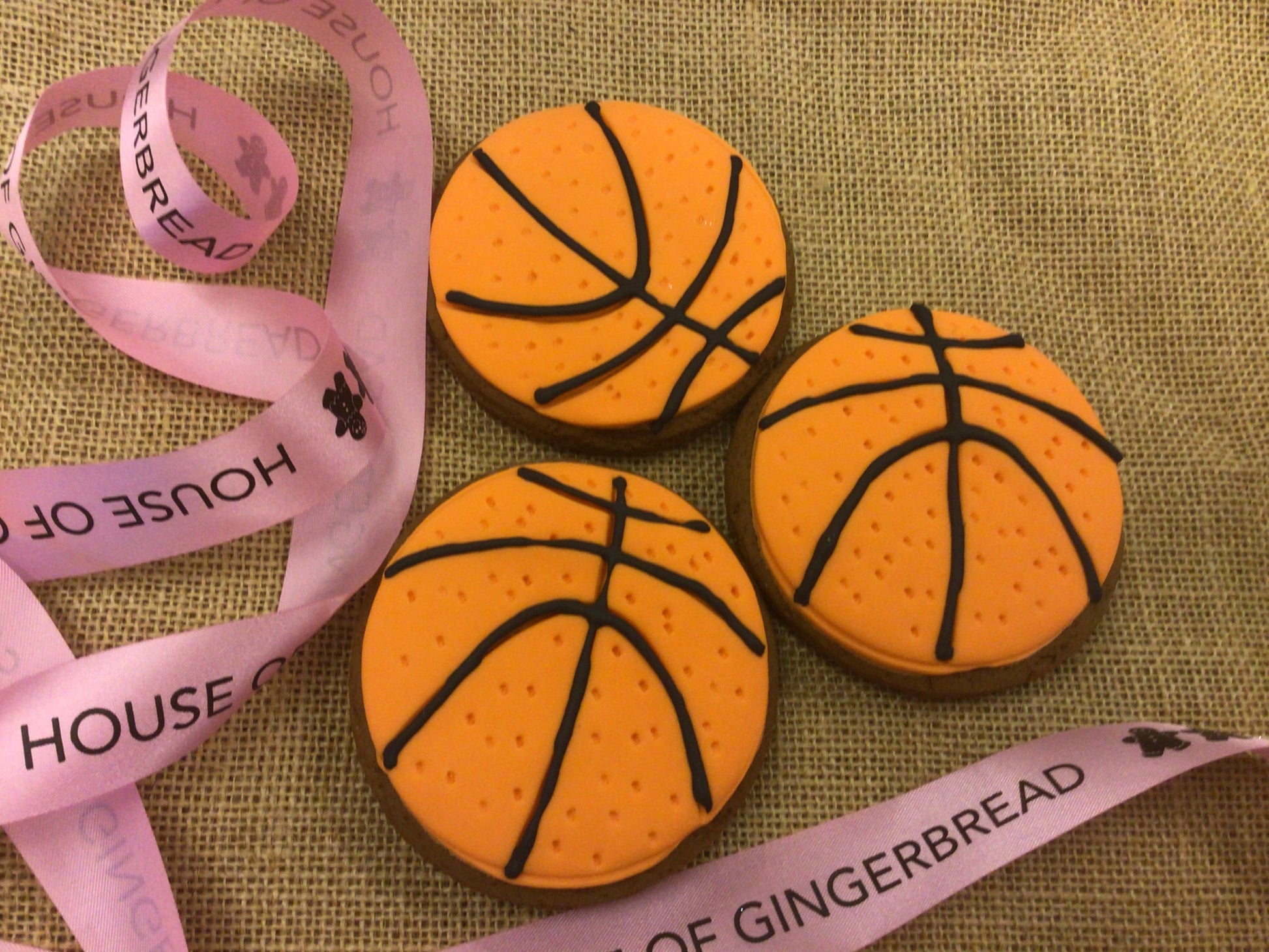 Basketball gingerbread cookie topped with fondant and royal icing.