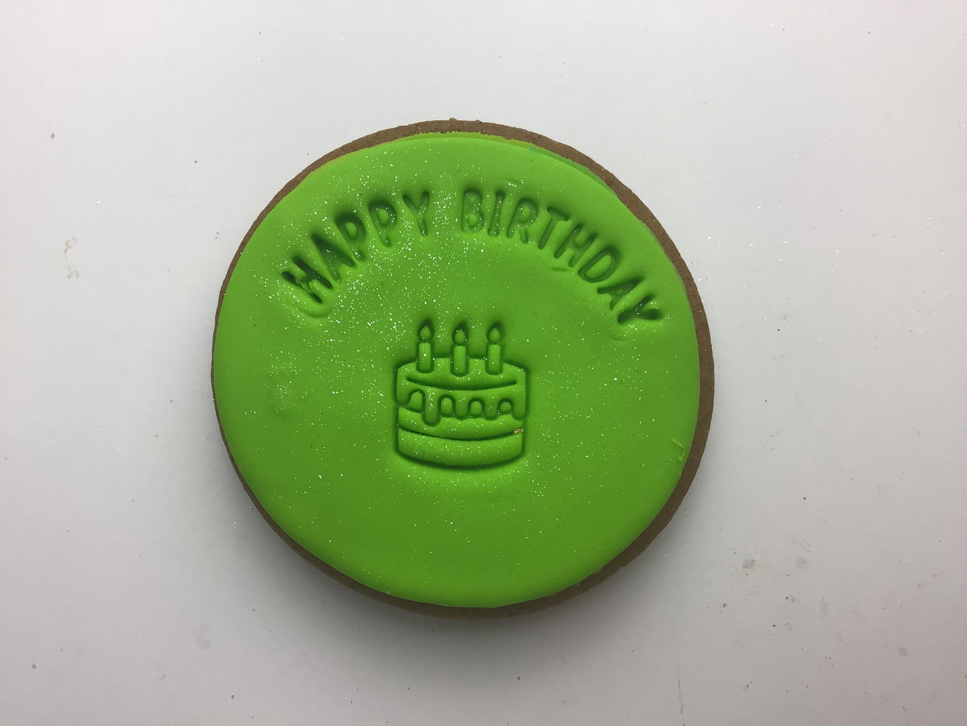 Happy Birthday gingerbread cookie topped with lime fondant.