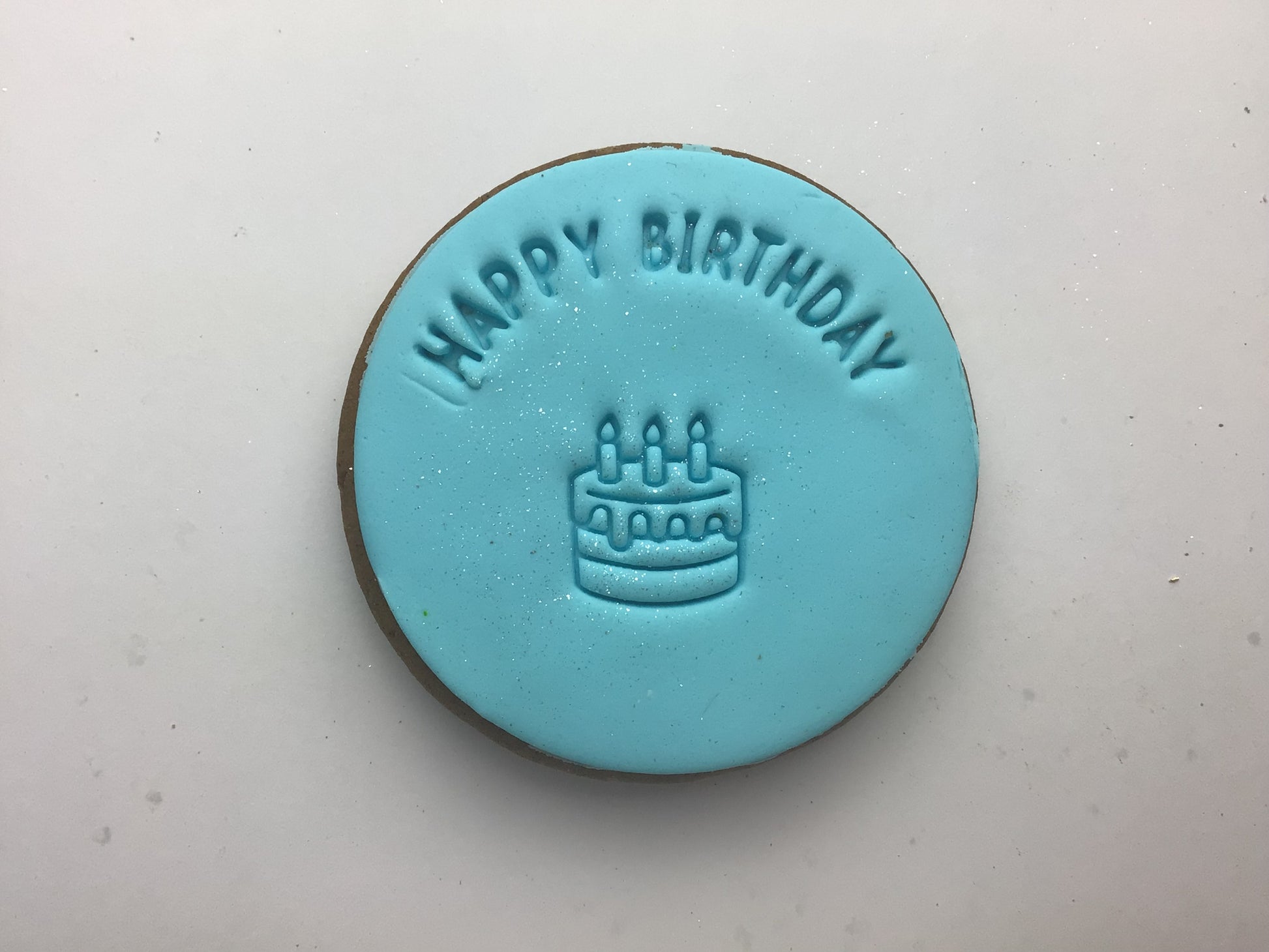 Happy Birthday gingerbread cookie topped with pastel blue fondant.