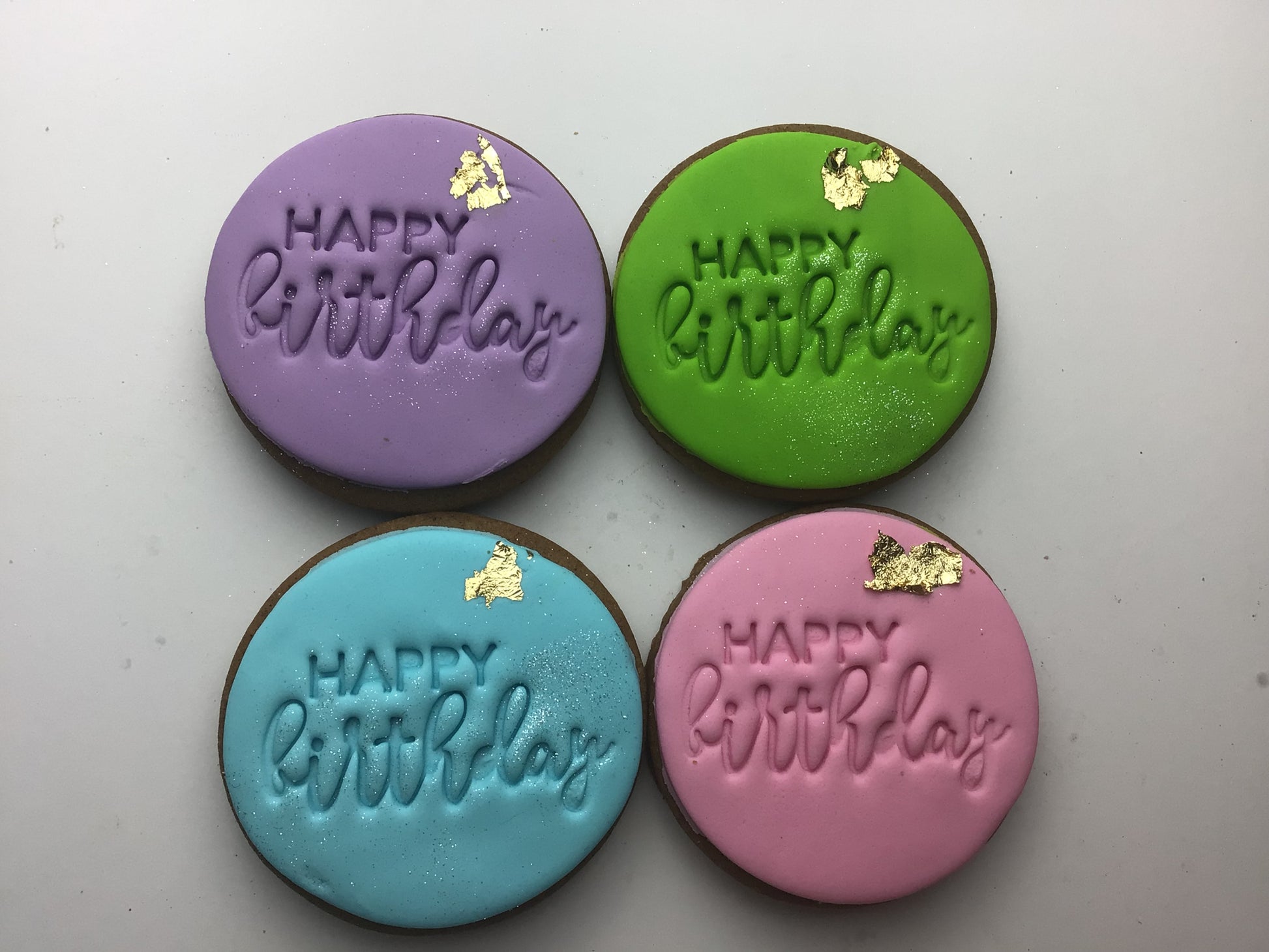 Happy Birthday gingerbread cookie topped with pink fondant.