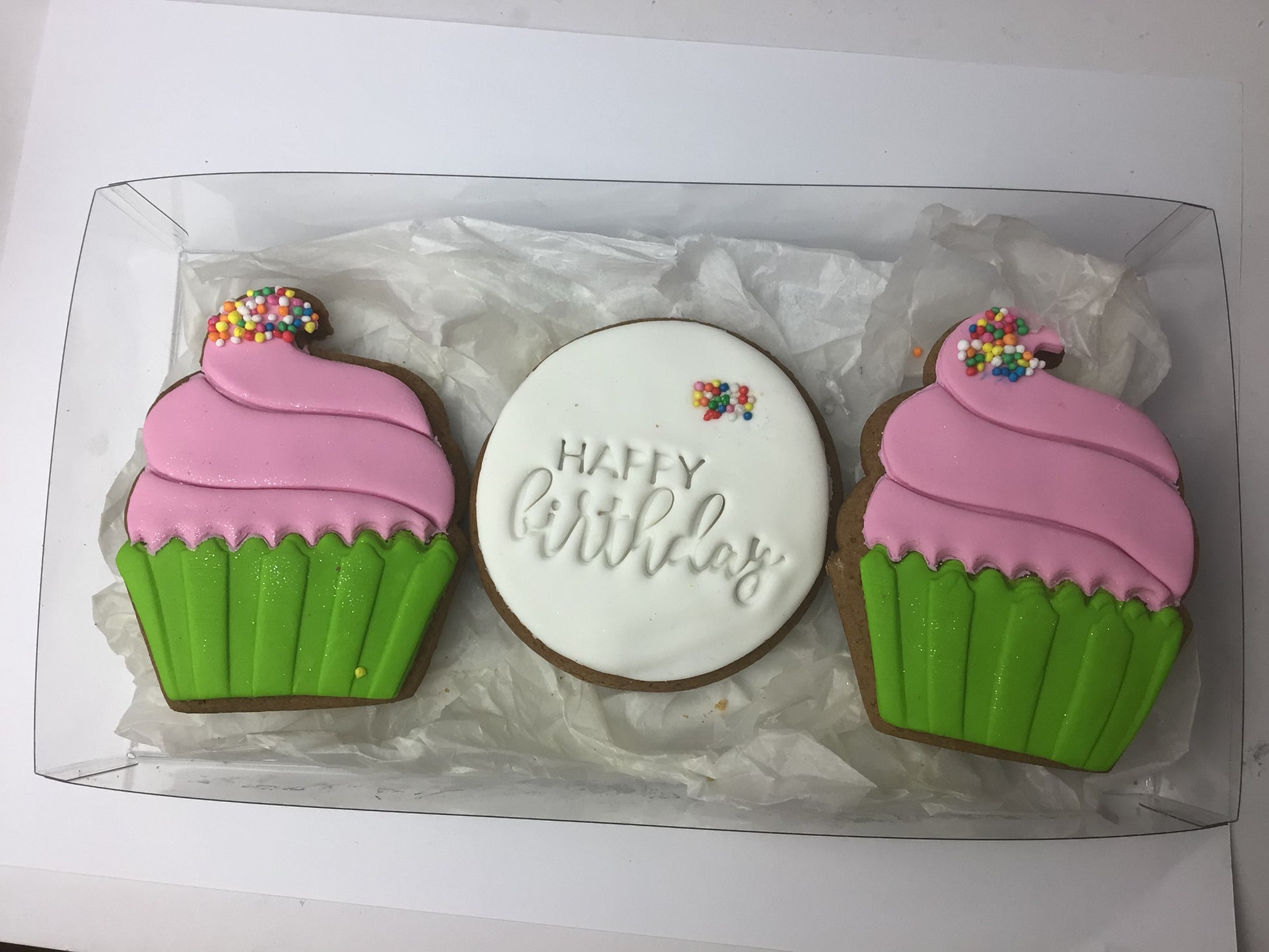 Birthday Cupcake Gift Box with trio set of gingerbread cookies topped with fondant.
