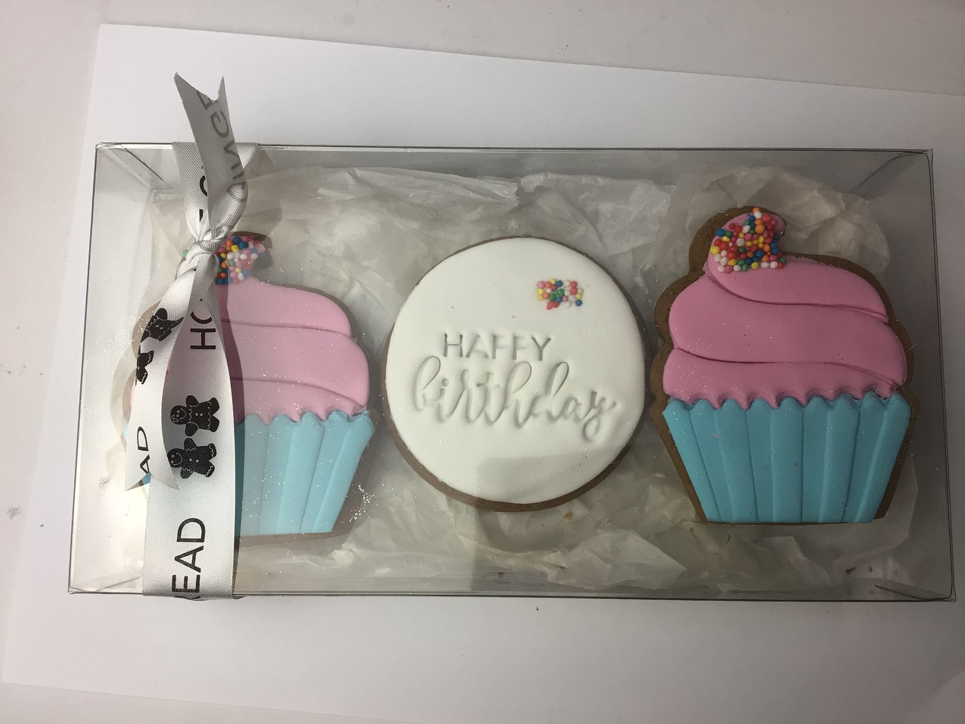 Birthday Cupcake Gift Box with trio set of gingerbread cookies topped with fondant.