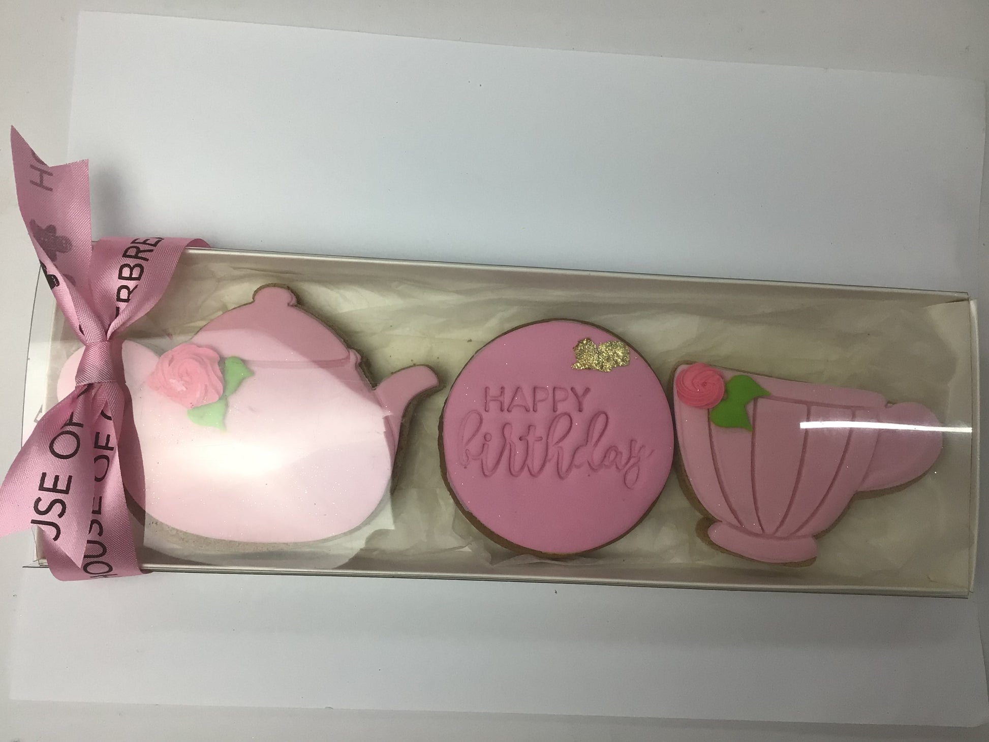 Teapot and Teacup Gift Box with trio set of gingerbread cookies topped with fondant.