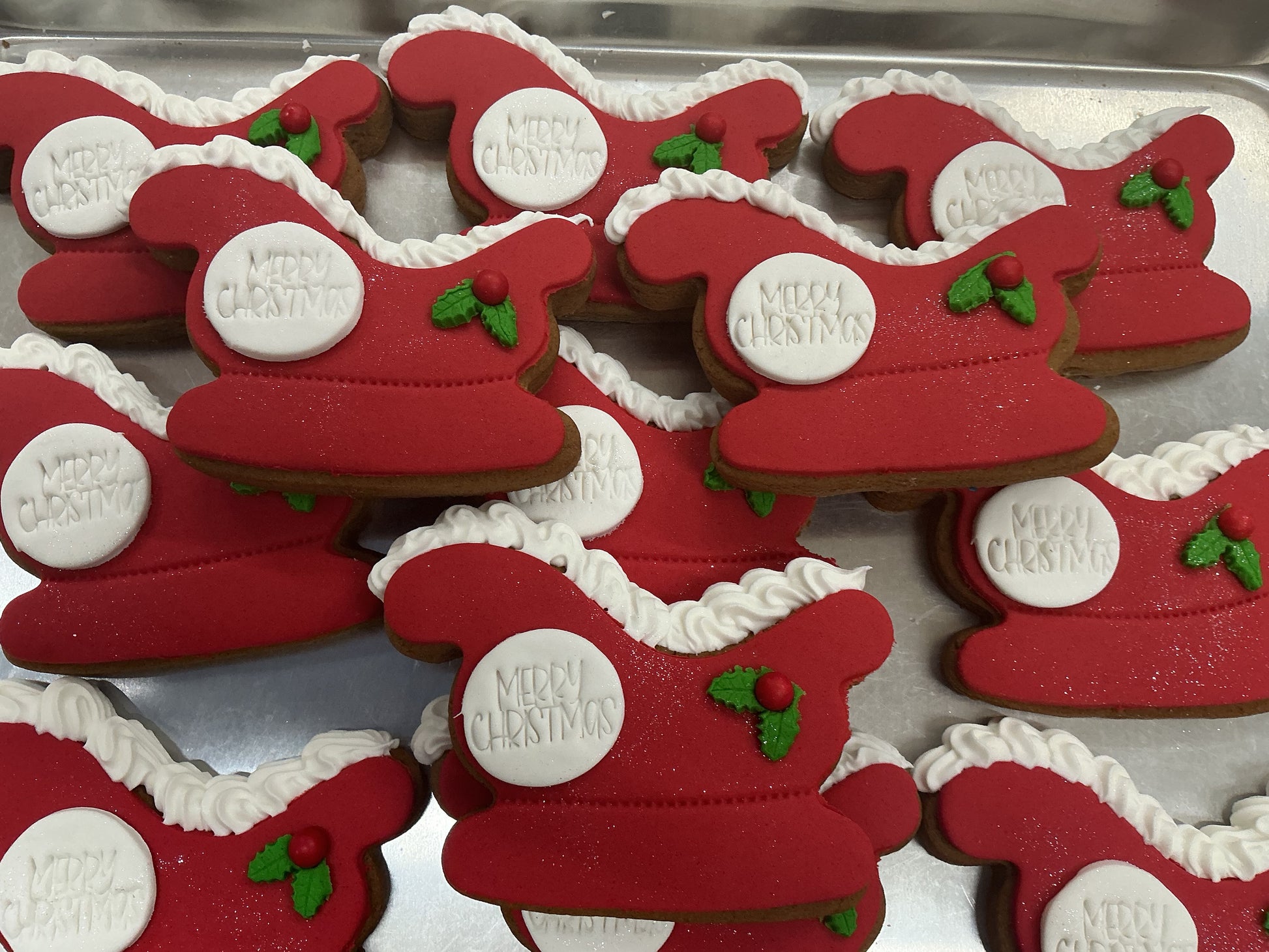 Santa’s ride has arrived! Sleigh themed gingerbread cookie topped with fondant icing and a red sugar ball