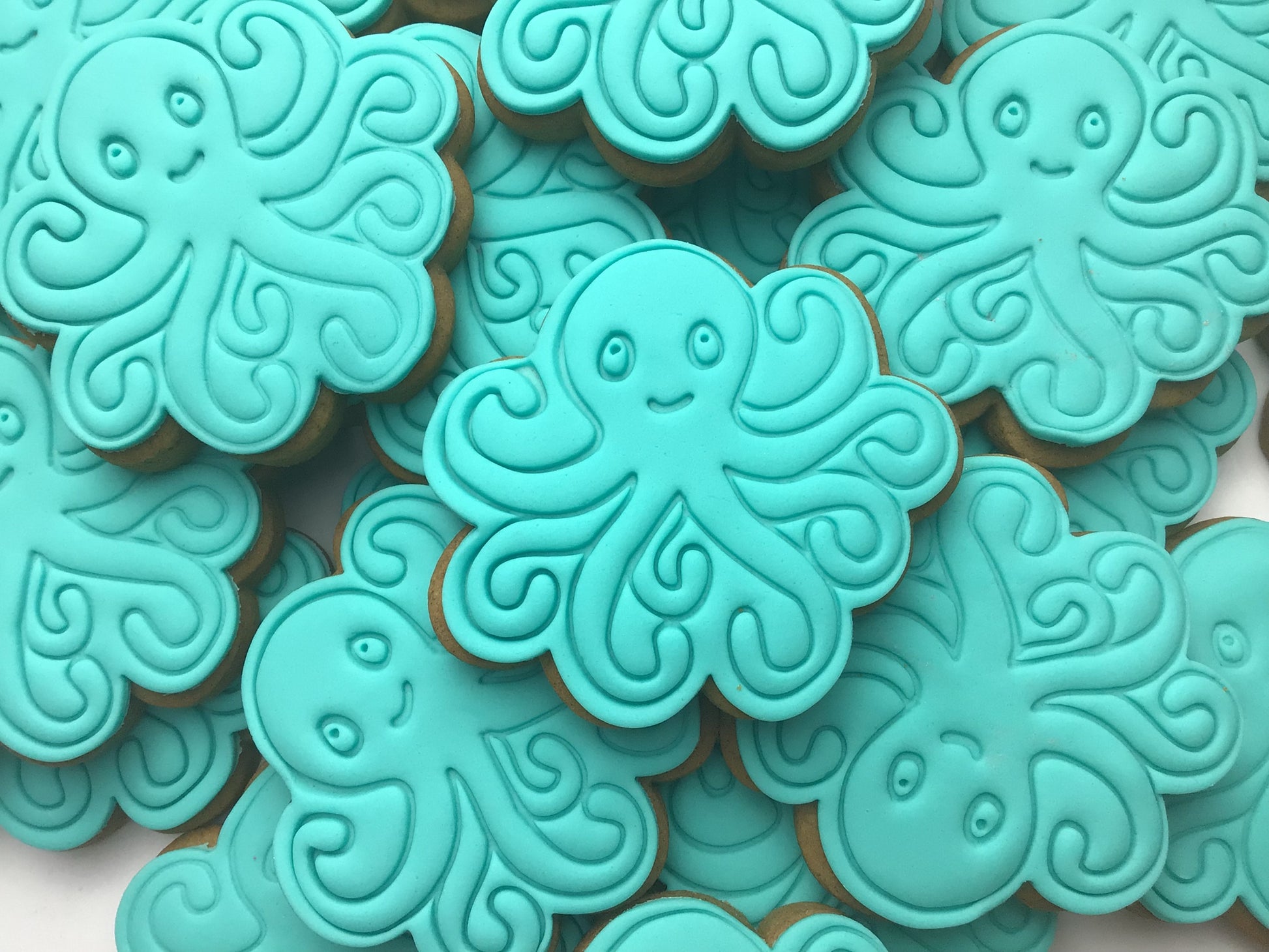 Octopus shaped gingerbread cookie topped with teal fondant.