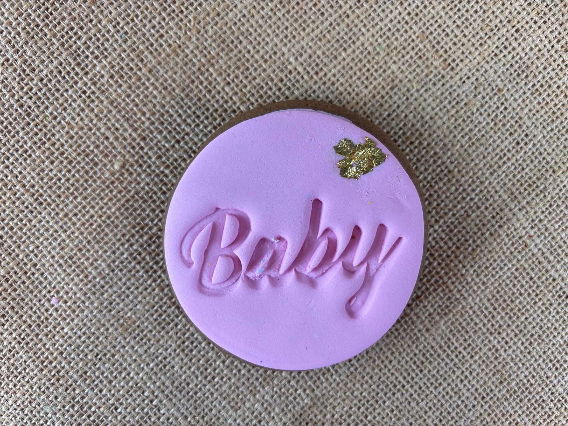 ‘Baby’ gingerbread cookie topped with pastel pink fondant.