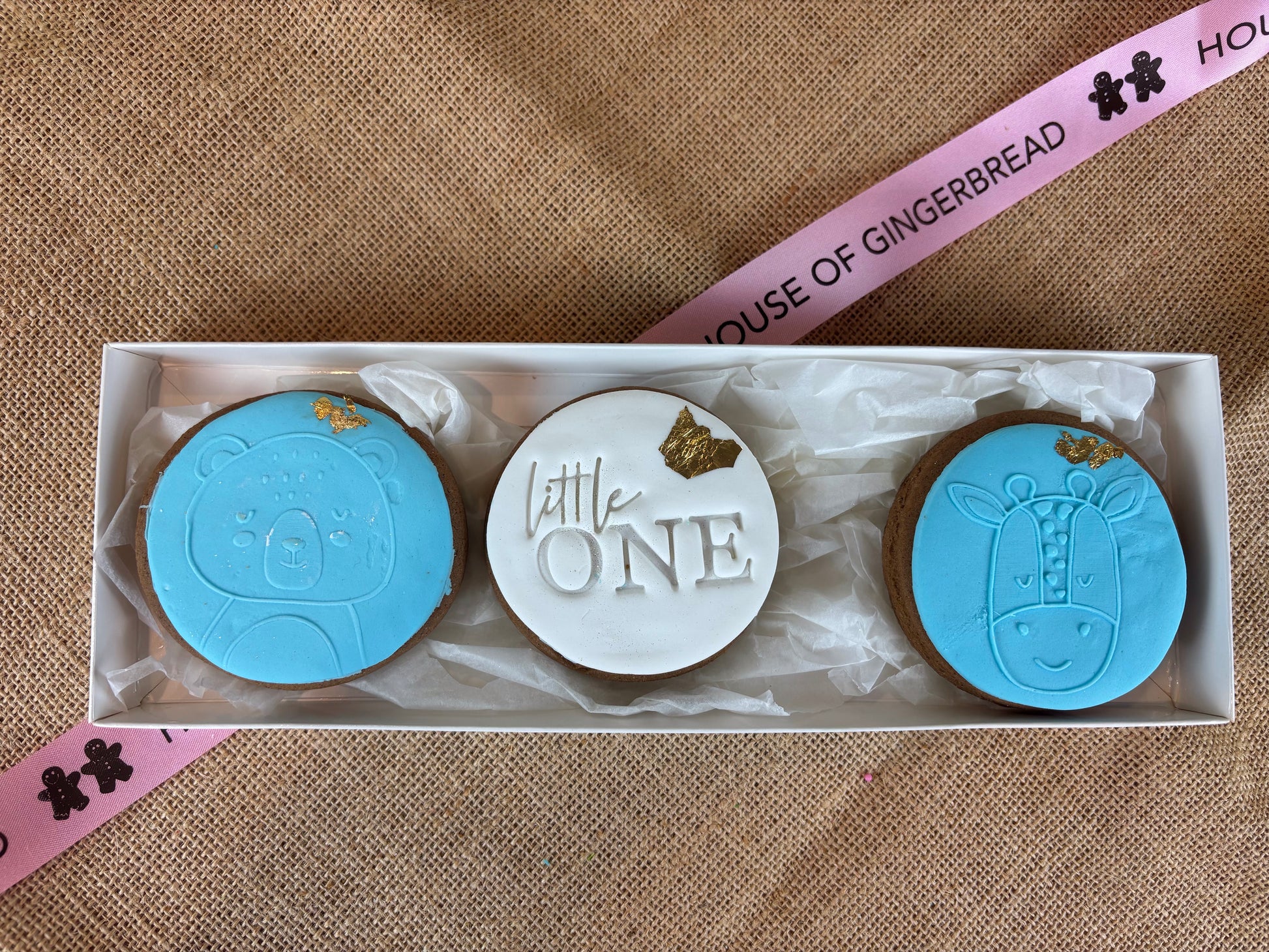 Little One Gift Box with trio set of gingerbread cookies topped with fondant.
